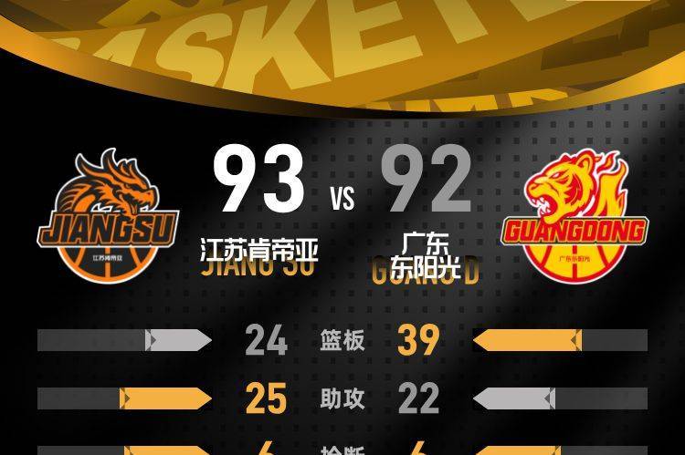 第四节开始后,双方比分始终紧咬,你来我往间比分多次打平。萨林杰连续得分帮助广东反超,随后广东打出一波小高潮,领先优势扩大到8分。江苏肯帝亚连续外线开火,贾尔斯命中三分,刘正清跟进再中三分把分差缩小到2分,庞峥麟抛投得手再次扳平比分。比赛最后26秒,崔永熙接徐杰助攻灌篮得分,广东以92-90重新取得领先。最后时刻,庞峥麟助攻吴羽佳三分命中完成绝杀,江苏肯帝亚93-92拿下胜利。